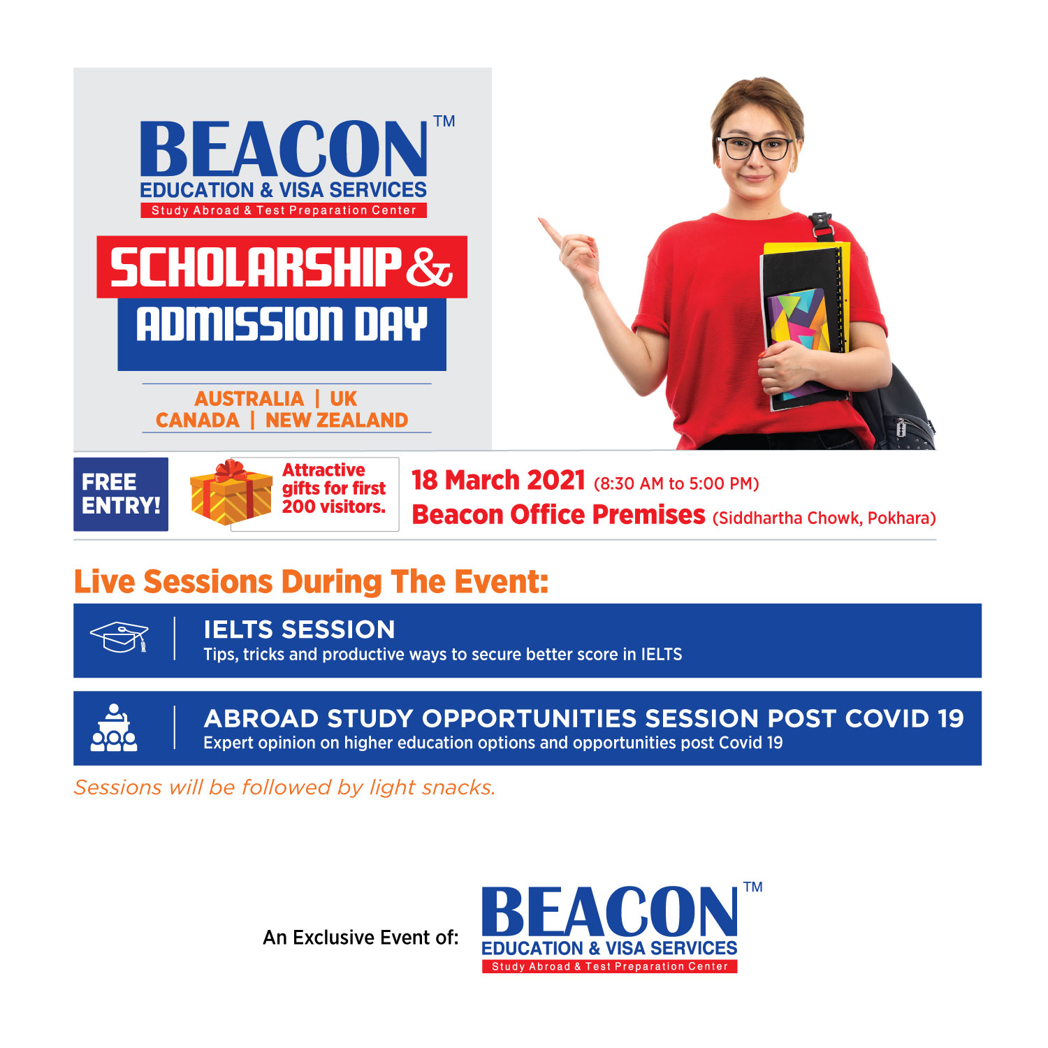पोखराको सिद्धार्थचोकमा कार्यालय रहेको बिकन एजुकेसन एण्ड भिसा सर्भिसेजले यहि चैत ५ गते ‘बिकन स्कलरसीप एण्ड एडमिसन डे’ आयोजना गर्ने भएको छ । आफ्नो १२ औं स्थापना दिवसको अवसरमा बिकन एजुकेसन एण्ड भिसा सर्भिसेजले बैदेशिक शिक्षाका लागि विदेश जान चाहने विद्यार्थी र तीनका अभिभावकहरुलाई लक्षित गर्दै यहि चैत ५ गते विहीबार सो कार्यक्रम गर्न लागेको हो । सिद्धार्थचोकस्थित बिकनको आफ्नै भवनमा हुने कार्यक्रम विहीबार पूर्वाह्न १० बजेदेखि अपराह्न ५ बजेसम्म जारी रहने संस्थाका कार्यकारी निर्देशक रुद्रप्रसाद अर्यालले जानकारी दिए ।