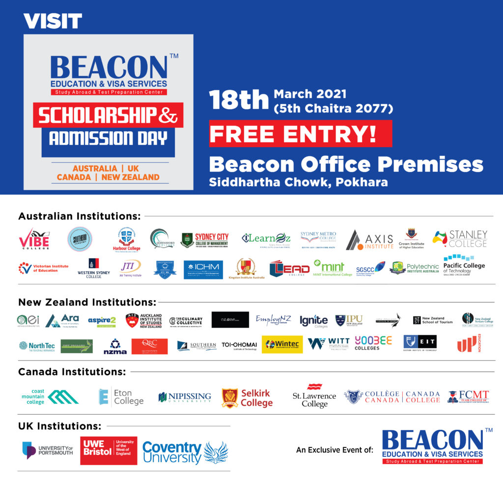 वान अप इभेन्ट म्यानेजमेन्ट प्रालिको ब्यबस्थापनमा हुने ‘बिकन स्कलरसीप एण्ड एडमिसन डे’मा कक्षा १२ उत्तिर्ण वा त्यस भन्दा माथि अध्ययनरत विद्यार्थी, तीनका अभिभावकलगायत सहभागि हुनसक्ने अर्यालले जानकारी दिए । साथै कक्षा १२ मा अध्ययनरत विद्यार्थी तथा तीनका अभिभावकसमेत सहभागि हुँदा राम्रो हुने बताए ।