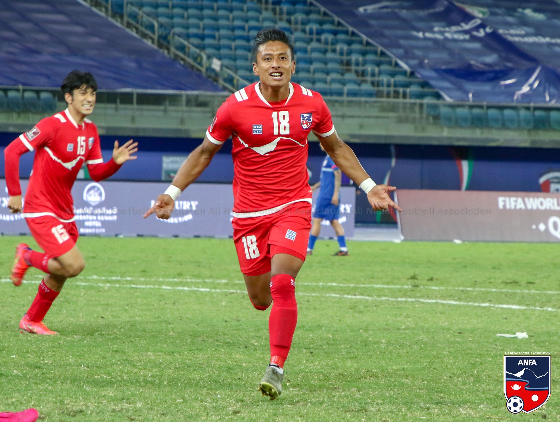 फिफा विश्वकप २०२२ तथा एसियन कप २०२३ को छनोट अन्तर्गत समूह चरणको छैटौँ खेलमा चाइनिज ताइपेईमाथि टोलीका लागि दोस्रो गोल गरेपछि कुवेत सिटीस्थित जाबेर अल अहमद अन्तर्राष्ट्रिय रंगशालामा ‘गोल सेलिब्रेसन’ मा रमाउँदै स्ट्राइकर नवयुग श्रेष्ठ। नवयुगलाई पछ्याउँदै पछिपछि अर्का मिडफिल्डर मनिष डांगी।