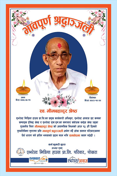सर्बाधिकार सुरक्षित गरिएको बारे : यस एभरेस्ट आवाज डटकमबाट सम्प्रेषित कुनैपनि समाचार, लेख, बिचार, टिप्पणी वा अन्य कुनैपनि किसिमको सामग्री सर्वाधिकार सुरक्षित गरिएको छ । यहाँ सम्प्रेषित कुनैपनि सामग्री बिना अनुमति साभार गरेको पाईए कानुनी कारबाहीमा जान बाध्य हुने जानकारी गराउँछौं ।