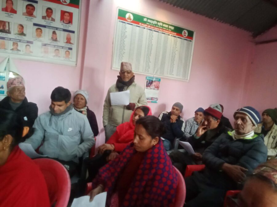 साधारण सभामा बोल्दै समुहका सल्लाहकार हुतराज शर्मा पौडेलले ग्रामिण क्षेत्रमा संचालित समुहले स सानो रकम बचत गरी स्थानीयमा बचत गर्ने बानीको विकास गरेको बताए । उनले समुहले बचत मात्र नगरी केही रकम उत्पादन मुलक कृषि क्षेत्रमा लगाउन सुझाव दिए । सल्लाहकार संयोजक ढुण्डिराज पौडेलले विभिन्न क्षेत्रमा सफलता हासिल गरेका सहकारीको अध्ययन गरी अनुभव आदान प्रदान गर्नुपर्नेमा जोड दिए । समुहका अध्यक्ष नन्दराज दाहालको अध्यक्षतामा भएको सभामा लेखा उपसमितिका संयोजक राजेन्द्रप्रसाद पौडेल, त्रृmण लगानी उपसमितिका संयोजक शोभाकर पौडेल, शिक्षा उपसमितिका संयोजक तिलकराज शर्मा पौडेल,शेयर सदस्य नारायण पौडेल,अर्जुन अधिकारी,शकंर पौडेल, धुर्वराज पौडेल, भरतराज पौडेल लगायतले कृषि तथा दुग्ध व्यवसायमा लागेका कृषकलाई प्रोत्साहन गर्नुपर्ने बताए ।