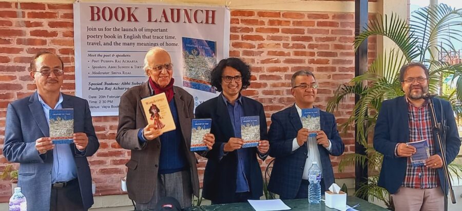 शुक्रबार, काठमाडौंको ठमेलस्थित पर्यटकीय कोलाहलका बिच बज्र बुक्समा एउटा सौम्य र बौद्धिक जमात उपस्थित थियो । सन्दर्भ थियो, कवि तथा साहित्यकार डा। पुष्पराज आचार्यको अङ्ग्रेजी कविता सङ्ग्रह ड्रेपरी अफ टाइमको लोकार्पण ।बज्र पब्लिकेसन प्रा.लिद्वारा प्रकाशित यो कृतिको विमोचन समारोह सामान्य औपचारिक कार्यक्रम मात्र थिएन, बरु यो पूर्व र पश्चिमको साहित्य चेतनाको सङ्गम जस्तै थियो । कार्यक्रमको सहजीकरण गरिरहेका डा. शिव रिजालले जब कवि पुष्पराजसँगको २५ वर्ष लामो सङ्गत, सिर्जनात्मक सहकार्य र प्राज्ञिक अनुसन्धानको किस्सा सुनाए, तब उपस्थित श्रोताहरूले एउटा सर्जकको निरन्तर साधनाको गहिराइ महसुस गरे ।