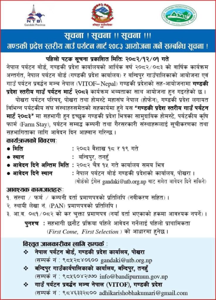 नेपाल पर्यटन बोर्ड गण्डकी प्रदेश र बन्दीपुर गाउँपालिकाको संयुक्त आयोजना एवम् गाउँ पर्यटन प्रवद्र्धन मञ्च नेपाल भिटोफ गण्डकी प्रदेशको सह–आयोजनामा सो मार्ट हुन लागेको हो । गण्डकी प्रदेशको ग्रामीण पर्यटन प्रवद्र्धन गर्ने उद्देश्यसहित आगामी वैशाख १८ र १९ गते मार्ट गर्न लागिएको नेपाल पर्यटन बोर्ड गण्डकी प्रदेशका प्रमुख मणिराज लामिछानेले बताए । पोखरा पर्यटन परिषद्, होमस्टे महासङ्घ नेपाल, गण्डकी प्रदेशलगायत पर्यटन सम्बद्ध सङ्घसंस्थासँगको सहकार्यमा हुने मार्टमा गण्डकी प्रदेशका सामुदायिक घरबास होमस्टे, पर्यटकीय कृषि फार्म ९फार्म स्टे० सहित विभिन्न ३० वटा होमस्टे कक्षहरू रहने उहाँले जानकारी दिए ।