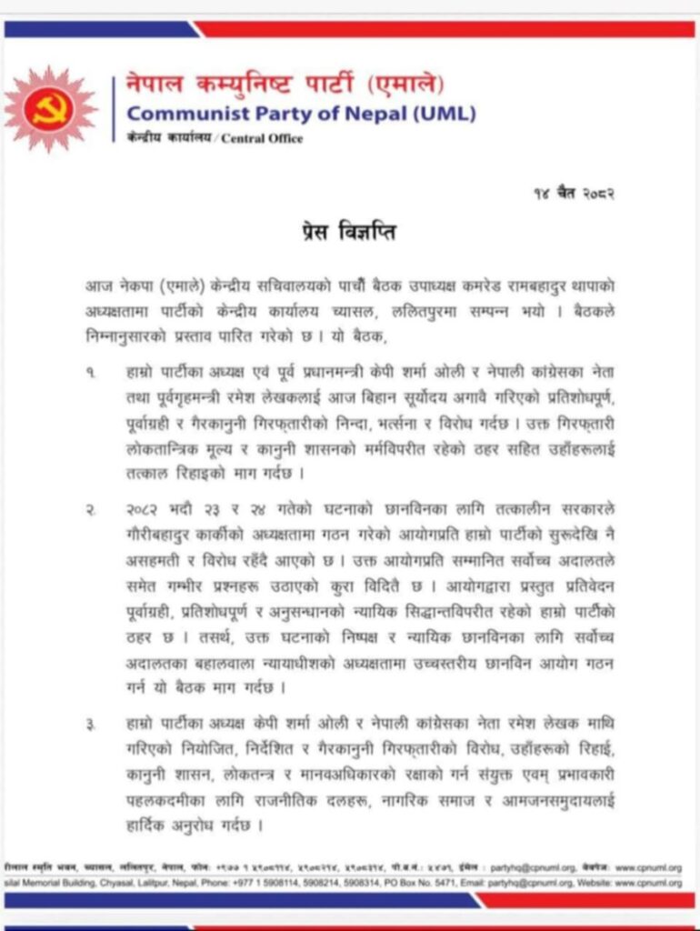 पार्टी अध्यक्ष केपी शर्मा ओलीको पक्राउको विरोधमा, नेकपा एमालेले ७७ वटै जिल्लामा विरोध प्रदर्शन गर्ने भएको छ ।